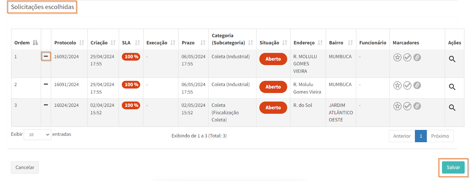 Após selecionar as solicitações desejadas, via lista ou via mapa, estas aparecem na aba “Solicitações escolhidas”, na parte inferior da página. Revise as solicitações e, caso precise remover alguma da lista, clique em .