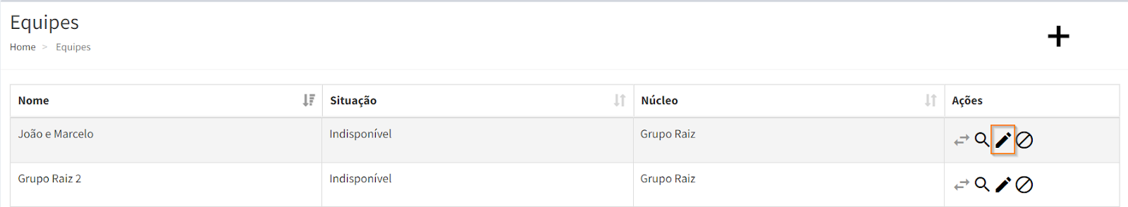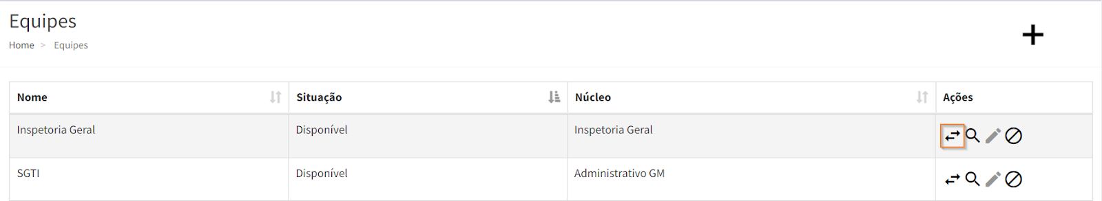 Para cadastrar, acesse o menu “Equipes” e clique no ícone , localizado no canto superior direito da página.