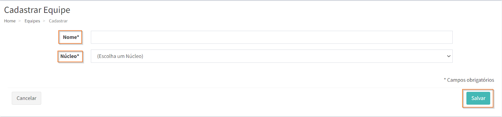 Insira o nome, selecione o núcleo ao qual a equipe pertence e clique .