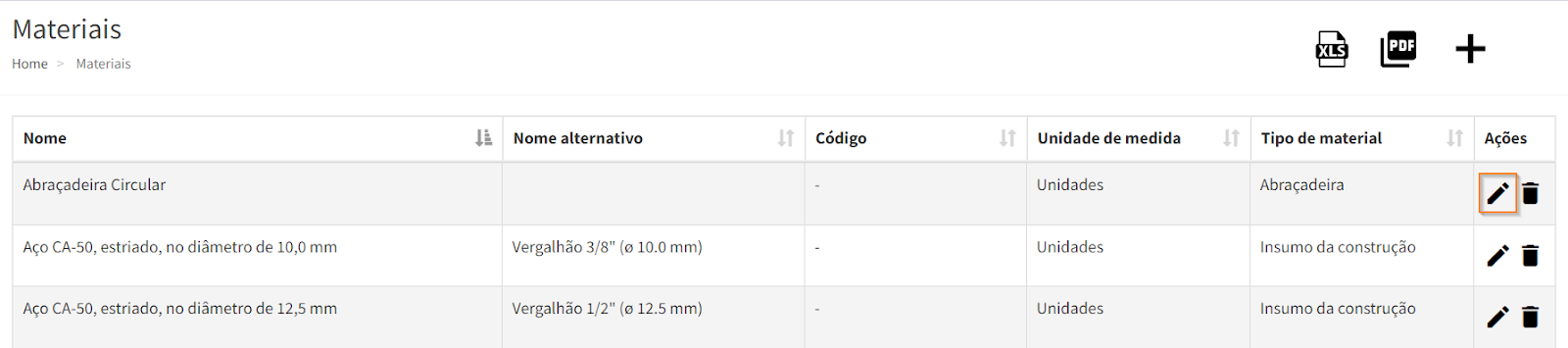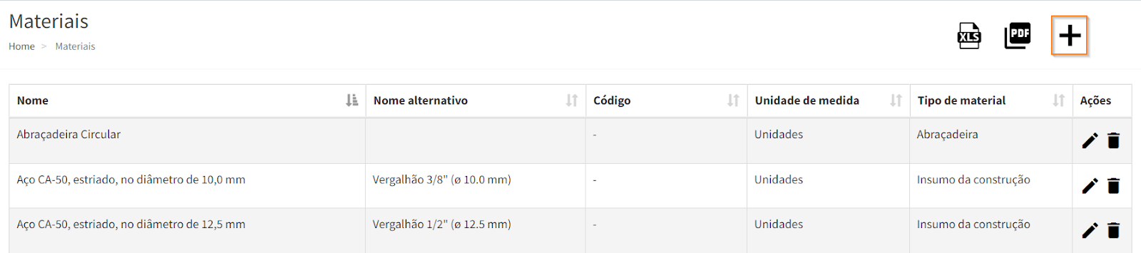 Para cadastrar, acesse o menu “Materiais” e clique no ícone , localizado no canto superior direito da página.
