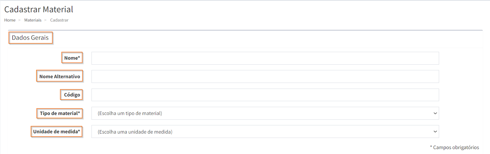 Em “Dados Gerais”, preencha os campos obrigatórios e caso seja necessário preencha os demais. Selecione o tipo de material e a unidade de medida aos quais o material deve estar associado.