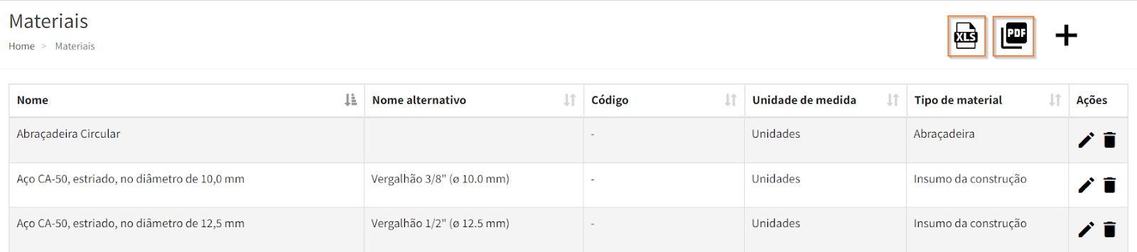 Para gerar relatório dos materiais em XLS, clique em , e para gerar relatório dos materiais em PDF, clique em