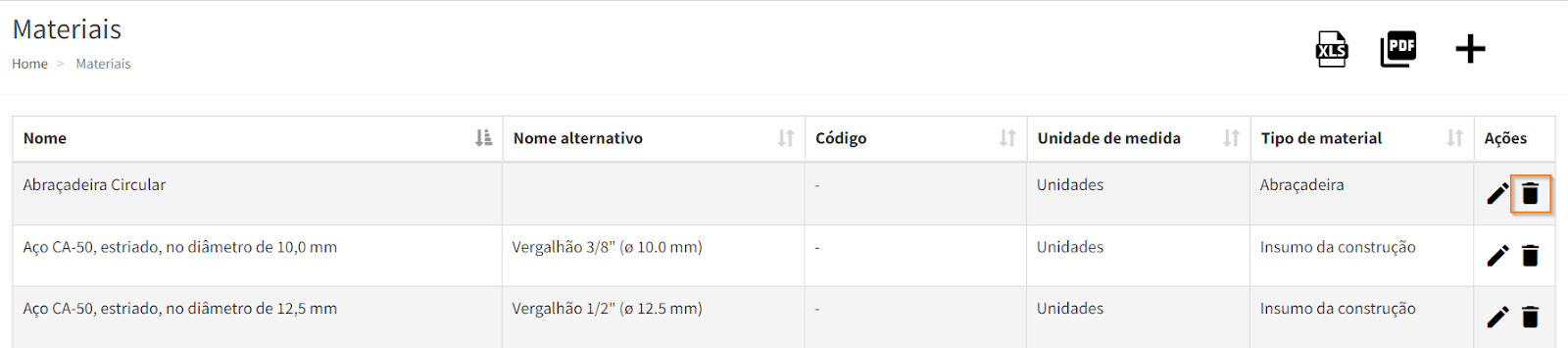 Para excluir, clique no ícone , localizado na coluna de ações e confirme a exclusão.
