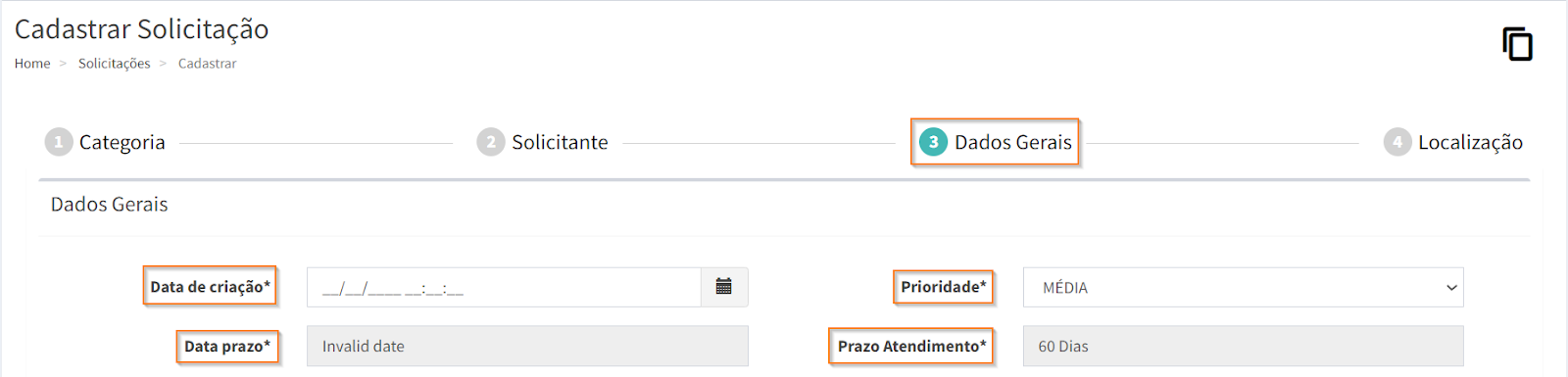 Importante: o campo “Prioridade” aparece preenchido automaticamente com o valor “Média”, porém é possível alterá-lo na caixa de seleção. Os campos “Data prazo” e “Prazo atendimento” são preenchidos automaticamente conforme o SLA cadastrado para a subcategoria da solicitação em questão.