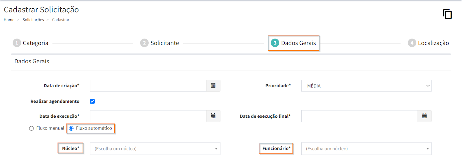 Ao selecionar a opção “Fluxo automático”, é necessário preencher os campos “Núcleo” e “Funcionário”.
