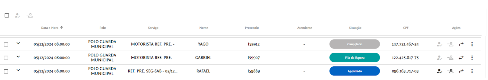 - Fila de Espera: Aparece quando o agendamento está em modo de espera. Essa situação ocorre quando não há vagas disponíveis no momento, mas você optou por ficar na fila para ser notificado caso alguém cancele. Assim, o primeiro na fila de espera automaticamente assume a vaga liberada por um cancelamento.